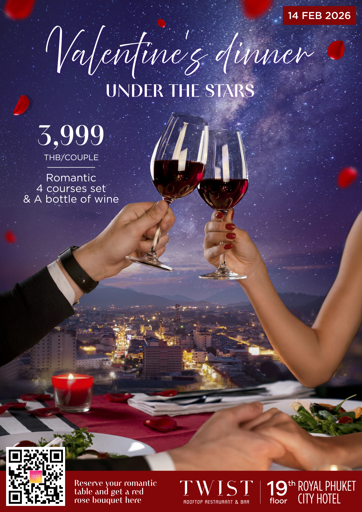 An Unforgettable Valentine’s dinner Under the Stars Celebrate your love with an all-inclusive starlit experience for only 3,999 THB net per couple. 🍷 4-Course Fine Dining & a Bottle of Wine 🌹 A Classic Red Rose Bouquet 📸 A Commemorative Couple’s Photo